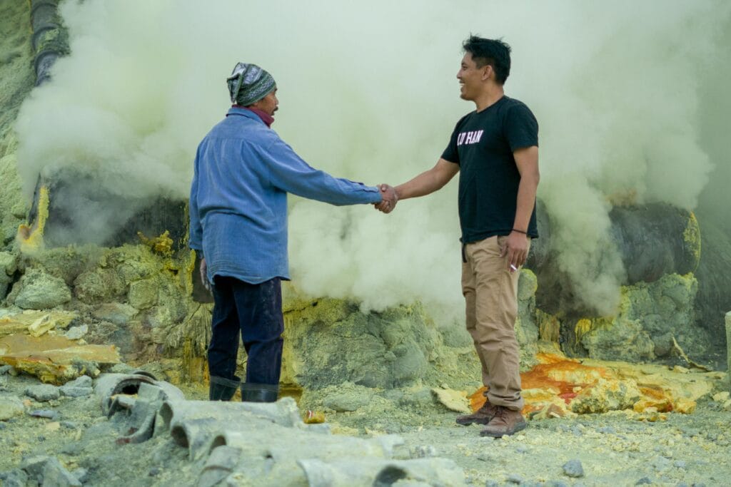 Working conditions at Ijen rank among the world’s most hazardous occupations. Miners endure sulfuric gas concentrations exceeding safe exposure limits by factors of 100 or more. Most workers use minimal respiratory protection, typically improvised cloth masks offering negligible filtration. Chronic respiratory diseases, dental deterioration, and chemical burns affect nearly all long-term miners.