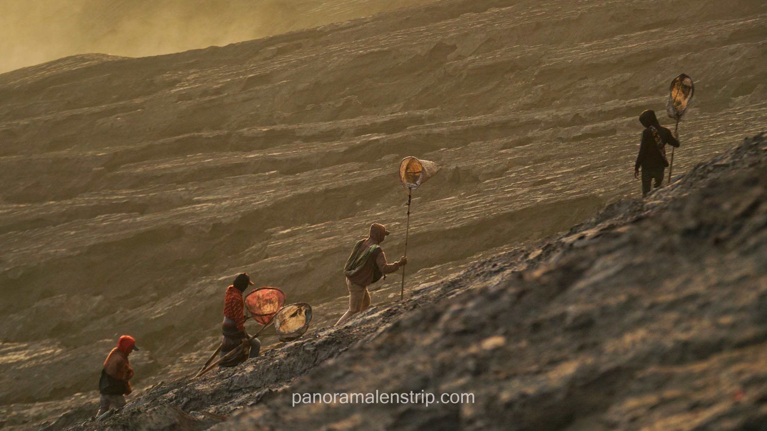 Tenggerese locals scale the dramatic, sunlit slopes of the Mount Bromo crater rim with long nets to catch sacred offerings during the annual Yadnya Kasada festival.