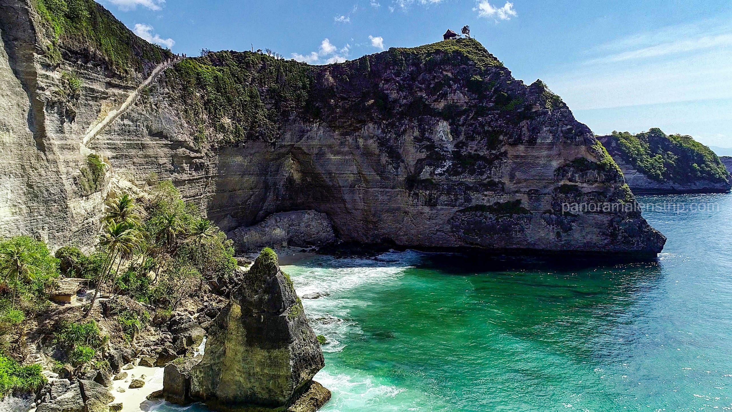 The towering, rugged limestone cliffs of Nusa Penida plunge steeply into the vibrant turquoise sea below.