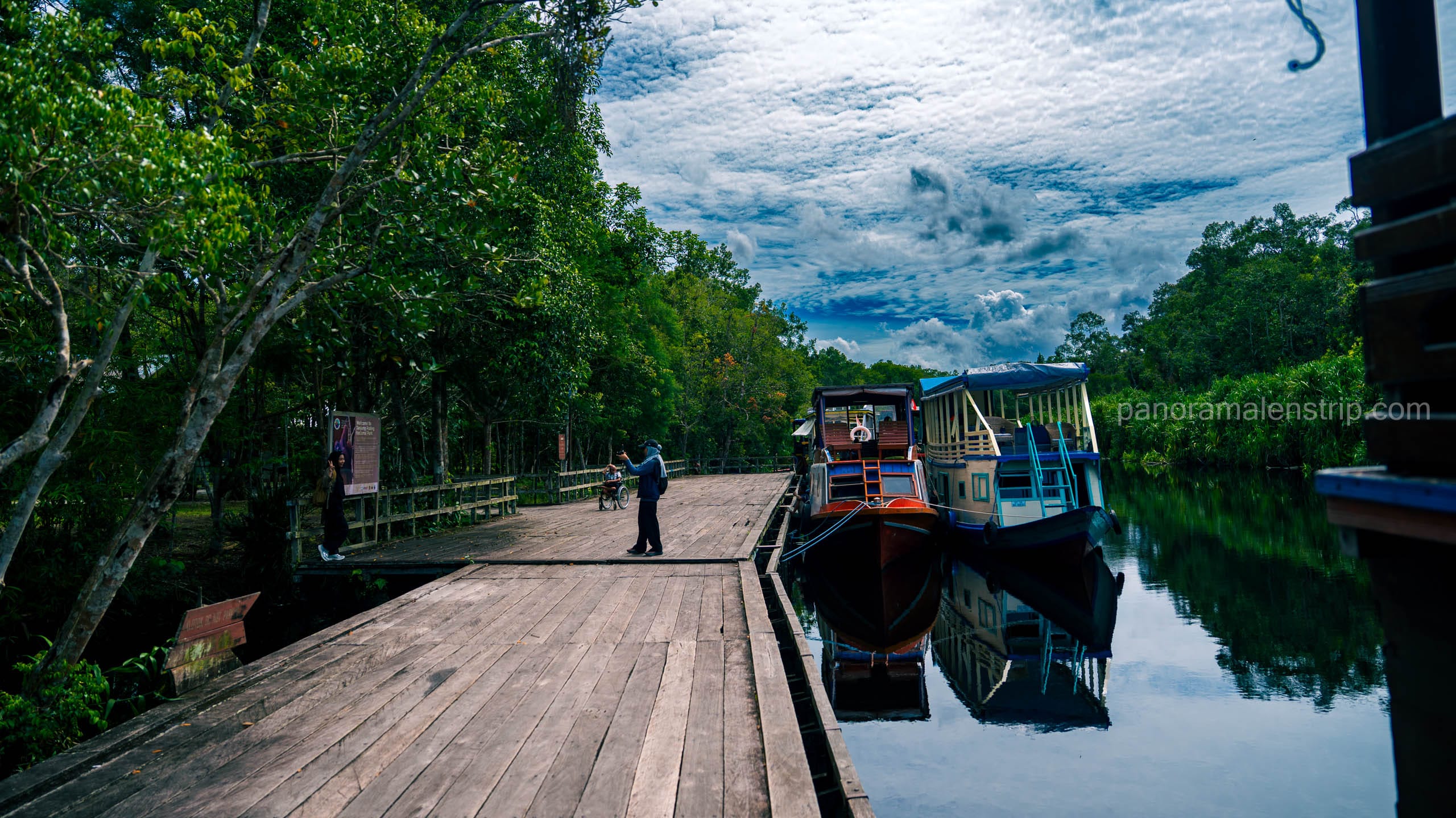 Tourists exploring the wooden pier alongside traditional klotok boats, preparing for a scenic jungle river cruise.