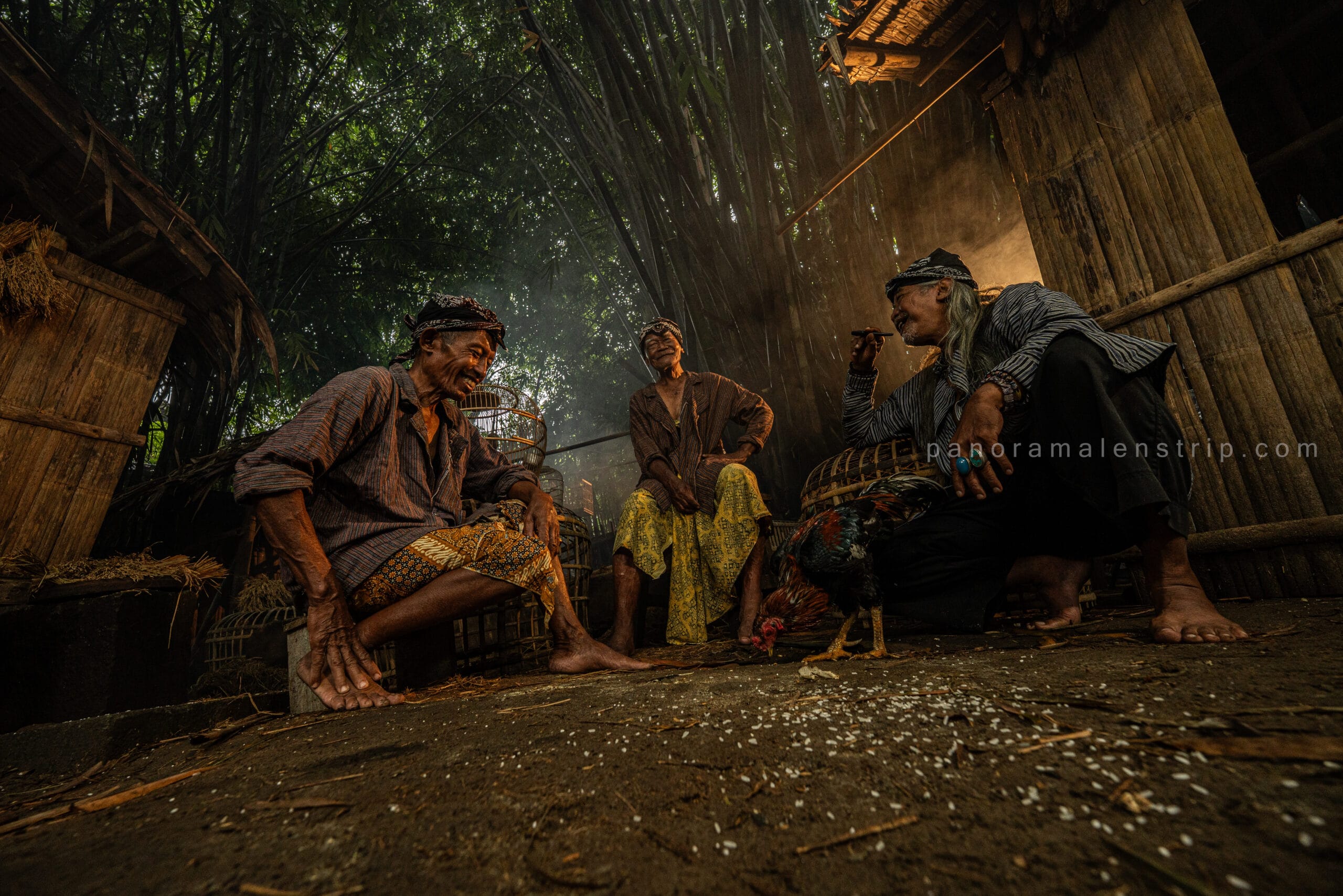 Preserving the timeless traditions of agricultural life: Javanese elders processing the rice harvest in a smoky, atmospheric rural village setting.